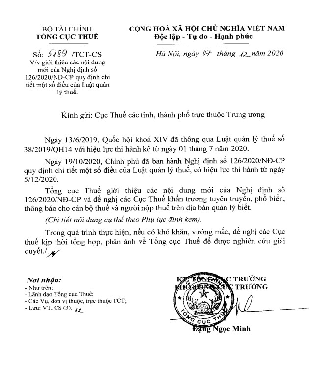 Tổng cục Thuế mới đây đã ban hành Công văn 5189/TCT-CS giới thiệu các nội dung mới của Nghị định 126/2020/NĐ-CP hướng dẫn Luật Quản lý thuế.